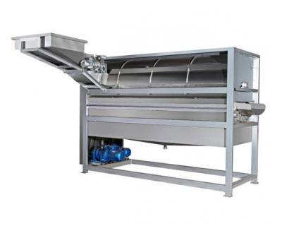 結(jié)構(gòu)特征及工作原理:該機(jī)主要有對(duì)壓輥三根、進(jìn)料斗、出汁斗、出皮斗、機(jī)架、傳動(dòng)等部分組成。工作時(shí)接通電源,將物料倒入進(jìn)料斗中,物料首先經(jīng)過第一和第二根壓輥的對(duì)壓擠破,然后進(jìn)入第一和第三壓輥進(jìn)行榨汁,皮從出皮斗排出,汁和部分肉從出汁斗排出,從而達(dá)到榨汁的目的;該設(shè)備除傳動(dòng)部位外其余均為不銹鋼制作。