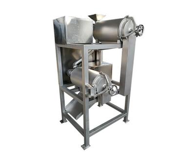 DJ型打漿機(jī):電機(jī)采用皮帶驅(qū)動(dòng),使安裝在花鍵上的轉(zhuǎn)子部件高速旋轉(zhuǎn)。水果從進(jìn)料口進(jìn)入機(jī)器,飼料漿刀片將原料螺旋送至打漿棒。在打漿棒的作用下,材料被搗碎。由于離心力的存在,原料中的果汁和肉類(已呈紙漿狀)通過(guò)篩孔進(jìn)入下打漿(篩孔取決于果核的大小),渣漿葉片將果核從渣口排出,從而實(shí)現(xiàn)果肉和礦渣的自動(dòng)分離。